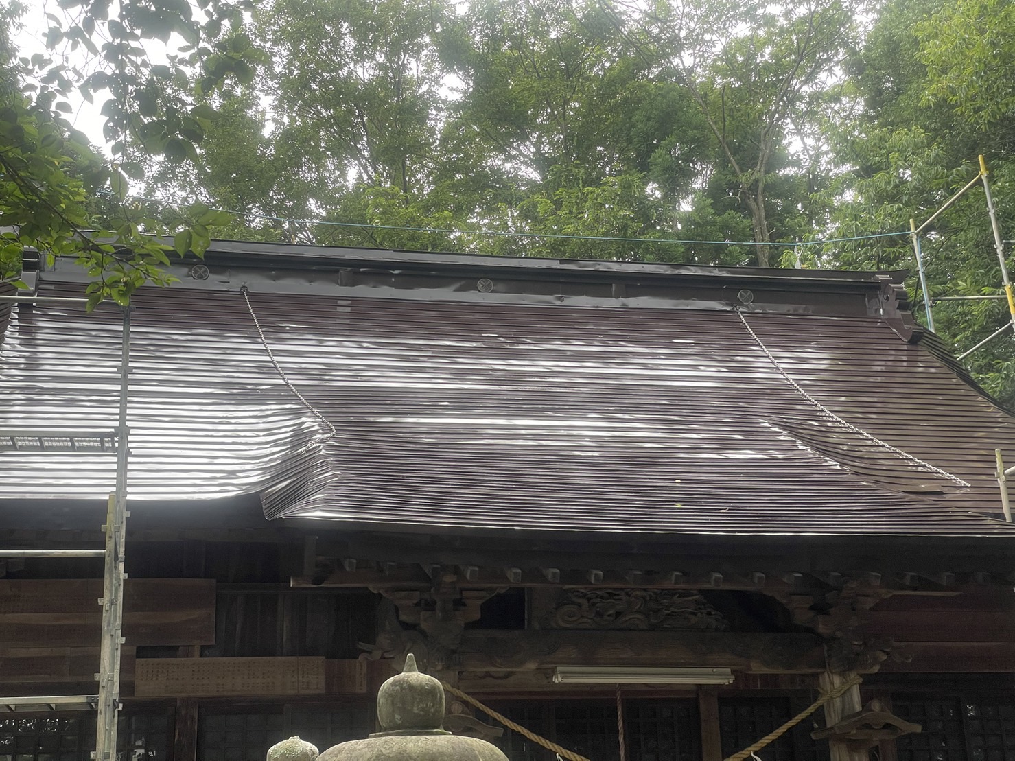 神社のトタン屋根。経年劣化の影響で全体の色が飛んでいました。防水効果が完全に切れてしまい、かなり傷んでしまっていますね。チョーキング現象が出ており、防水効果が切れてしまっています。