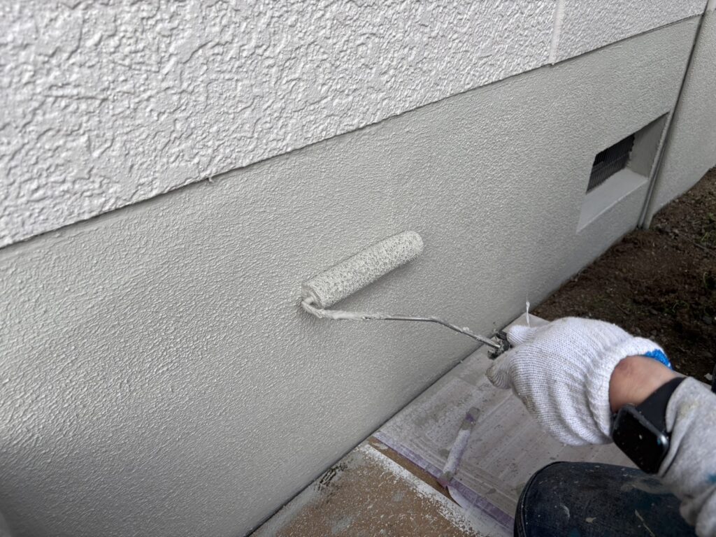 今回のお客様の基礎は劣化が多く見受けられたため、普通に塗るのではなく厚付け塗装にしました。初めに基礎の下地処理を行い基礎のひび割れ・基礎の破損個所の補修から始めました。