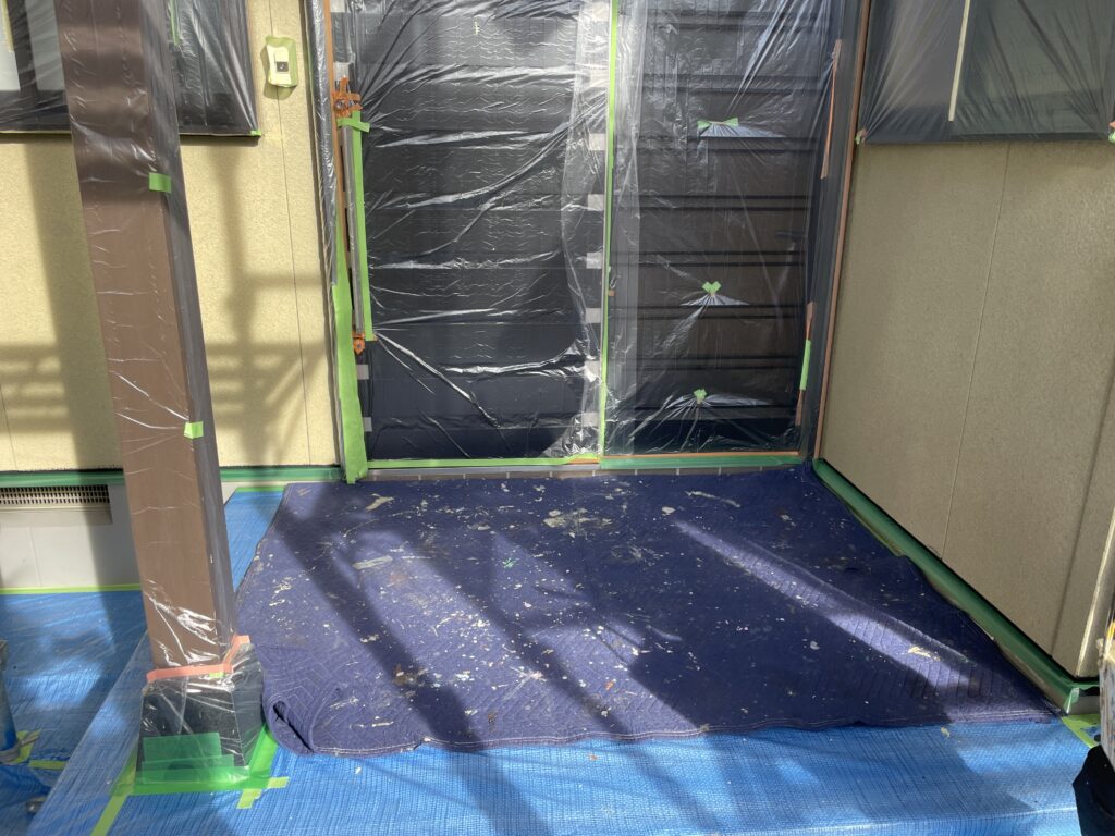 玄関前は、お客様が必ず通る場所でもありますので、作業をする際には特に注意を払っています。塗料が床面や玄関まわりに飛び散らないよう、まずは床に専用の布シートをしっかり敷き込み、周囲が汚れないように養生(ようじょう)をしてから作業を始めます。