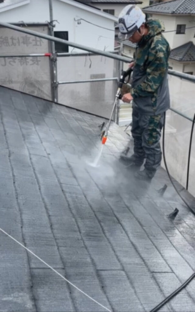 まず、塗装の前に高圧洗浄で、屋根・外壁全体の汚れをしっかり落としていきます!(下写真)