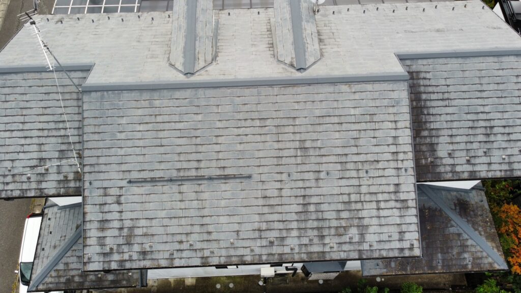 調査時のヒヤリングで屋根の汚れと劣化が気になるとの事で、実際ドローン調査してみると2F屋根全体的に経年劣化が目立ち、北面には多くのコケが生えておりました。外壁もチョーキング(白亜化現象)が発生しておりました。近内様の方から長持ちさせたいとおっしゃっておりましたので、今回屋根・外壁共に無機プランをご提案させていただきました。