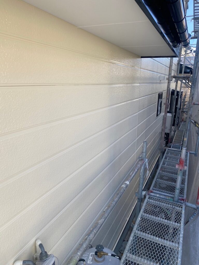 ・中塗り・仕上げ塗材に関西ペイントのセラマイルド(ジプトーン色)を塗布いたしました。(下写真2枚)