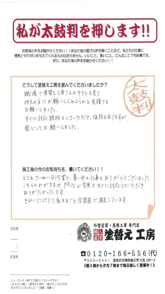 「箭内さん。今回、百年塗装店(旧:塗替え工房)を選んでご依頼をして頂き誠にありがとうございました。