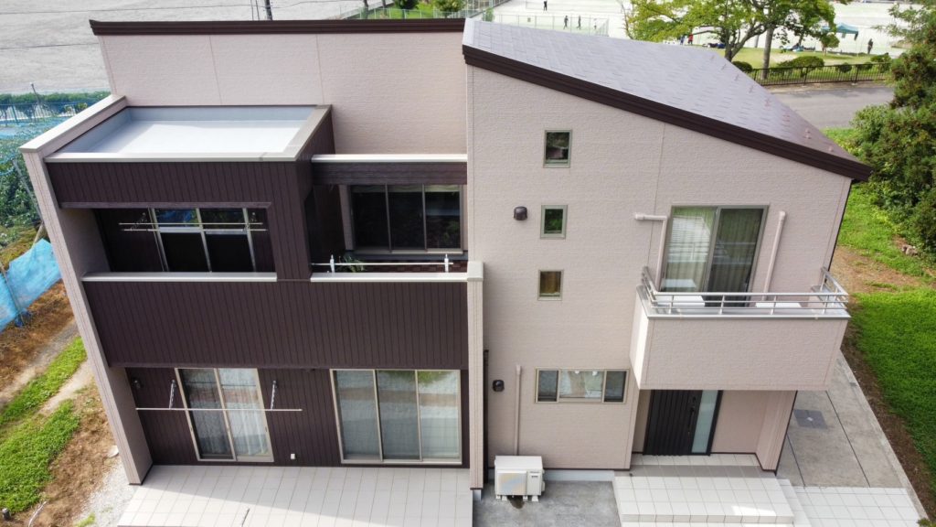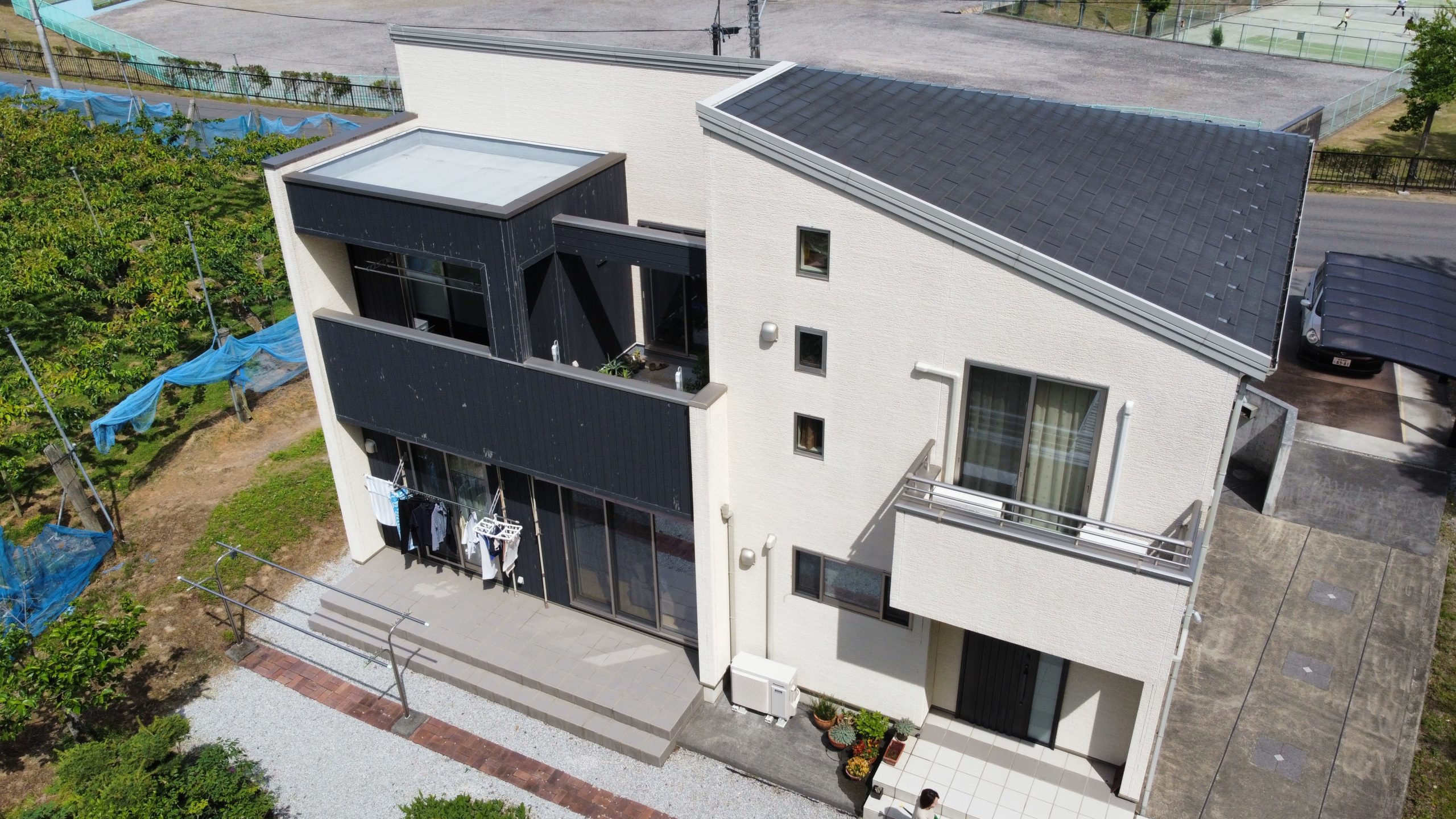 調査時のヒヤリングで外壁の汚れとシーリング劣化の状況が気になるとの事で、実際調査してみるとシーリングに亀裂・剥離・欠損が見受けられました。外壁に関しましても、換気フードの汚れ・長年の土ほこりなどが付着している状況でした。ドローンで屋根の調査をしたところ、屋根全体的にコケが付着していましたので今回、屋根・外壁・付帯部を長持ちさせたいとの事でしたので、耐久年数が長い『無機塗料』のプランを提案させていただきました。