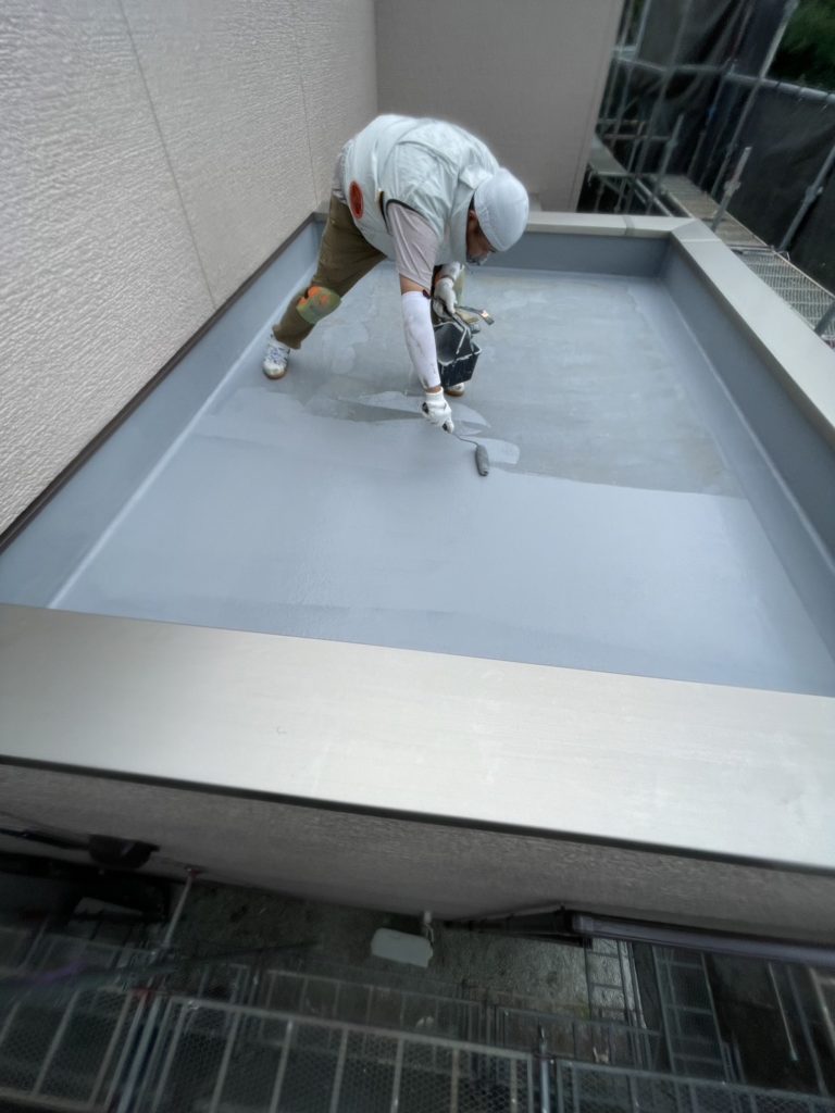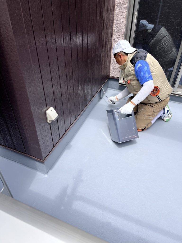 ・ベランダの材質がFRPの為、研磨紙で素地調整を行った後にアセトンで拭き上げました