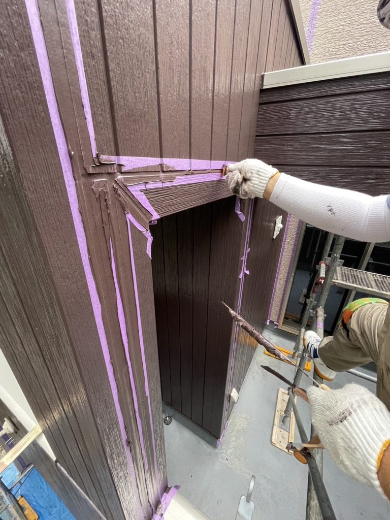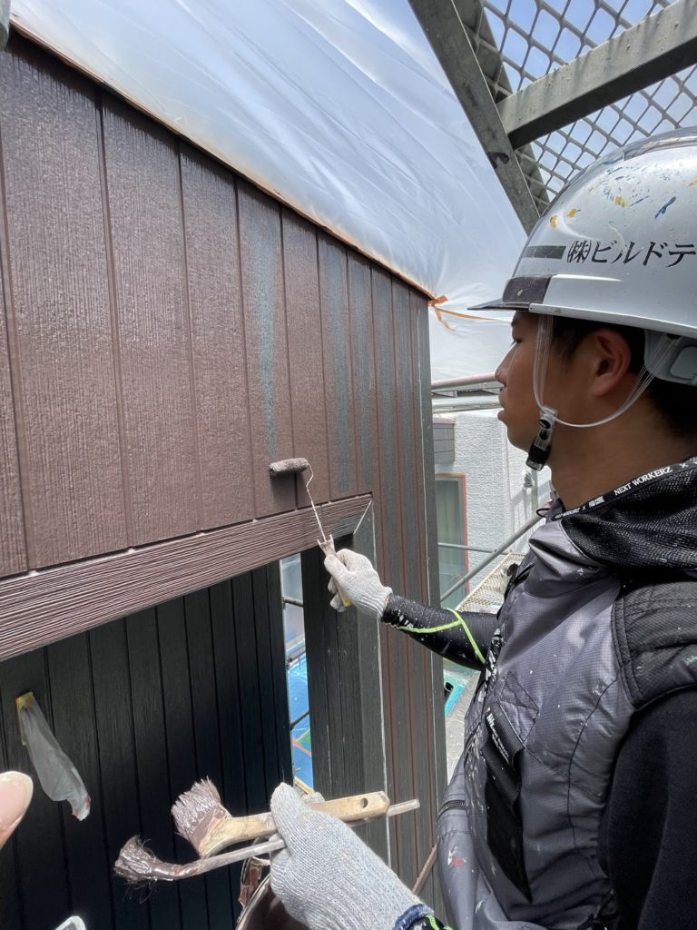 中塗り・仕上げ材に日本ペイントのファインパーフェクトセラミックベスト(ナポリブラウン)を塗布いたしました。(下写真2枚)