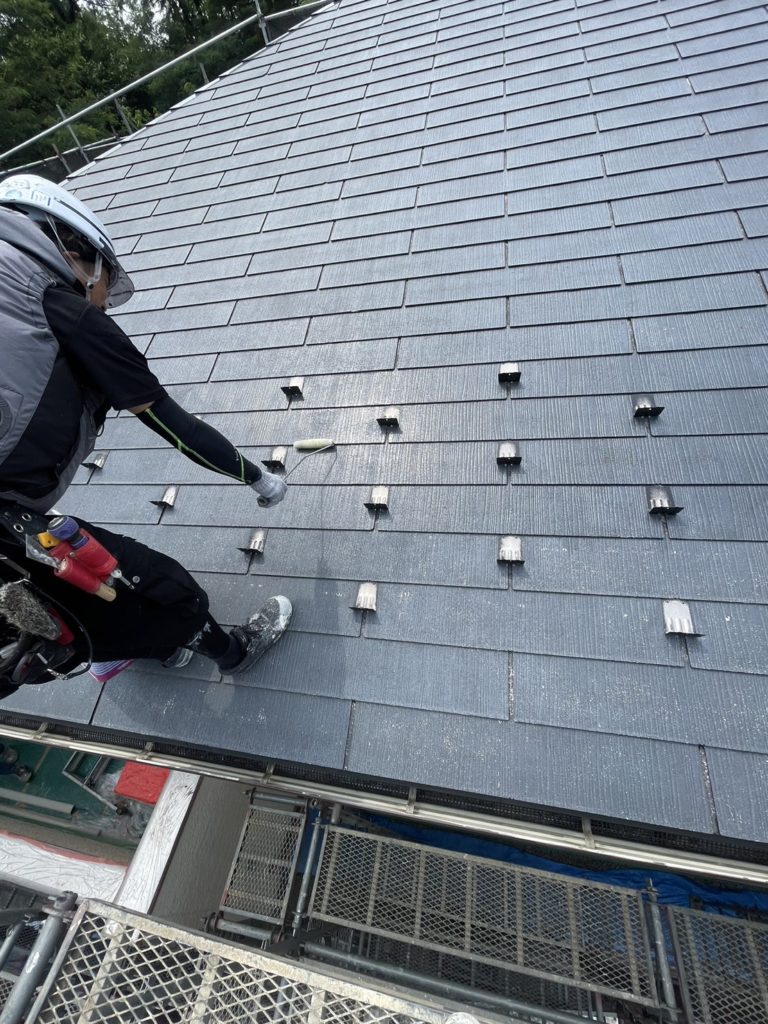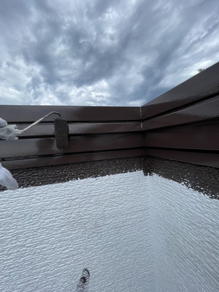 ・全体を高圧洗浄後、屋根の下塗りにファイン浸透シーラーを塗布しました。