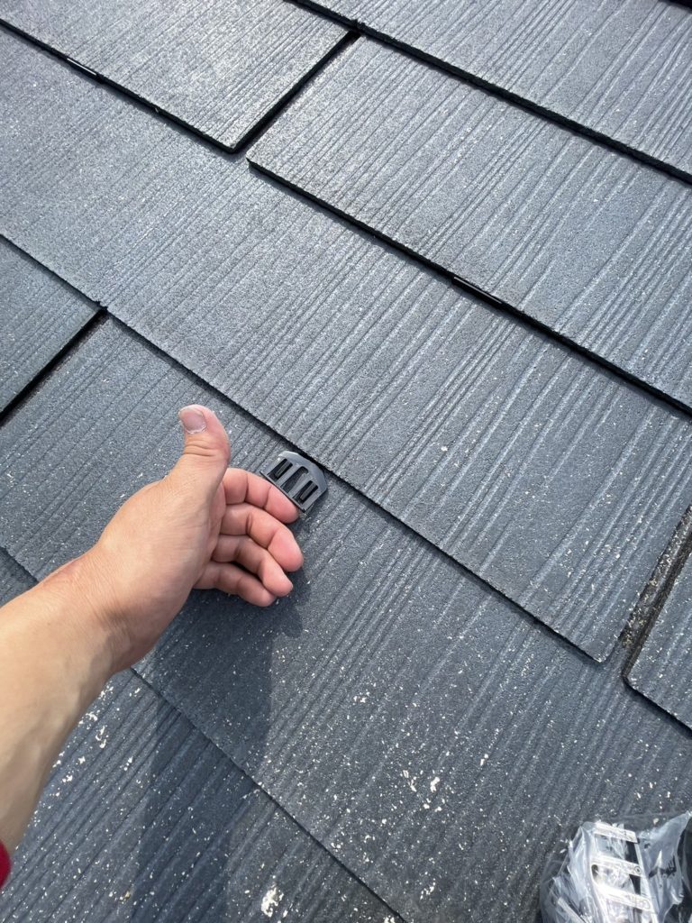 塗装する際に屋根材同士がくっつかないように「縁切り」ができる材料を設置していきます。(下写真)