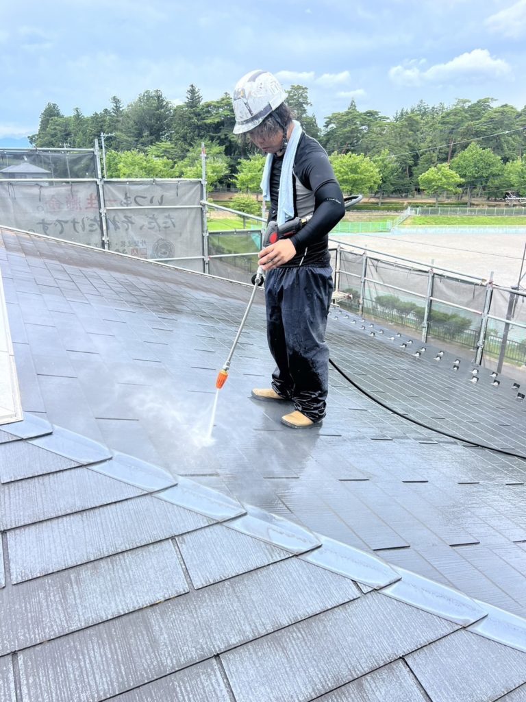 まず、塗装の前に高圧洗浄で、屋根・外壁全体の汚れをしっかり落としていきます!(下写真2枚)