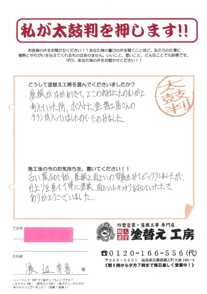 「渡辺さん。今回、百年塗装店(旧:塗替え工房)を選んでご依頼をして頂き誠にありがとうございました。
