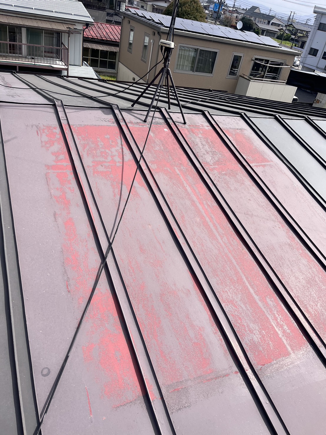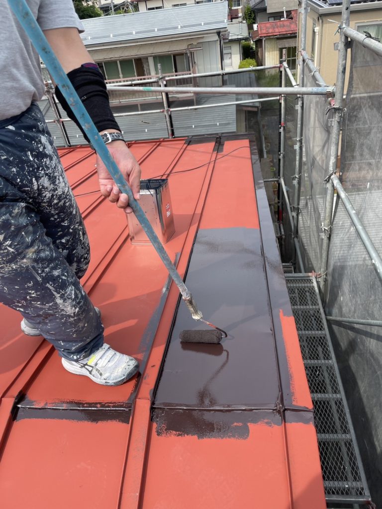 全体を高圧洗浄、下地処理したら、屋根の下塗りに日本ペイントの1液ハイポンファインデクロ(赤さび)を塗布しました。(下写真)