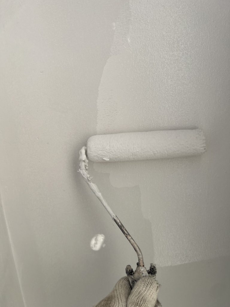 外壁の1部と軒天の既存の漆喰に関しましては、日本ペイントのケンエースG=ⅡのN-90を塗布いたしました。(下写真)