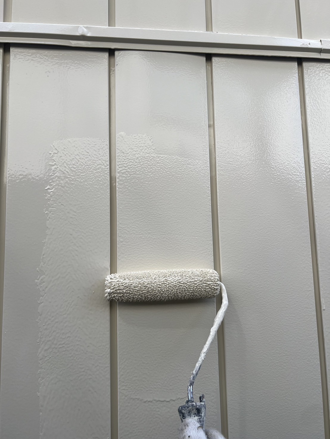 外壁に関しましても鉄板サイディングの為、日本ペイントの1液ハイポンファインデクロ(白さび色)を塗布いたしました。(下写真)
