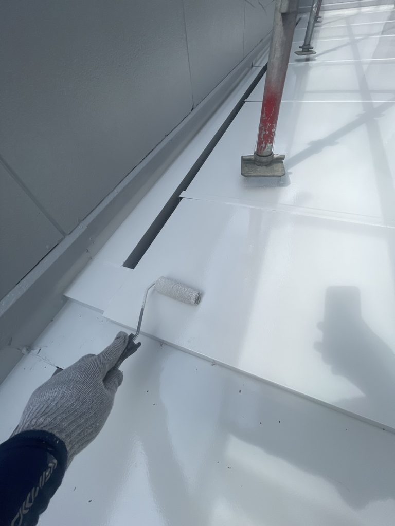 そして、いよいよ仕上げ塗りです。中塗りと同じ工程で施工させていただきました。社内検査時にツヤ引け、硬化不良等の施工不良も無く美しい仕上がりとなりました。(下写真2枚)