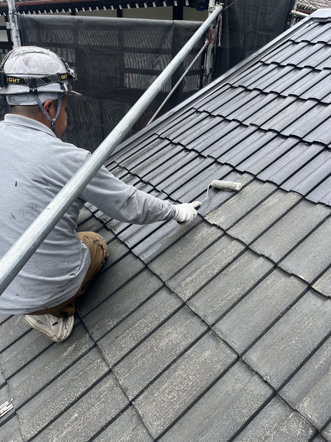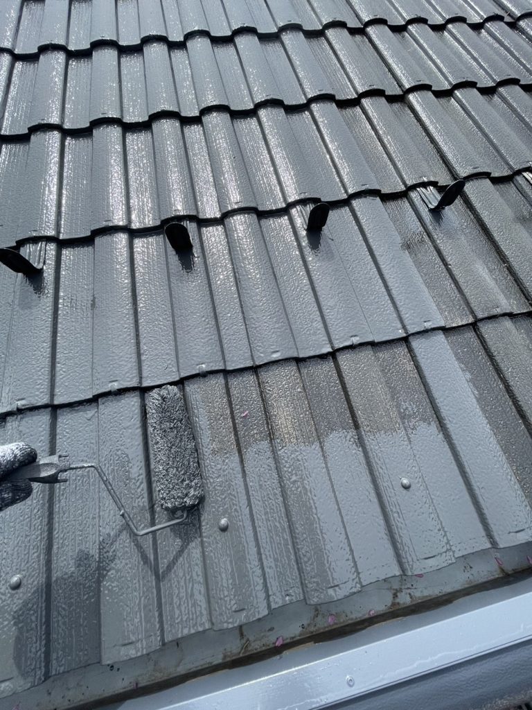 全体を高圧洗浄、屋根の下塗りにエスケー化研のエスケー強化シーラーを塗布しました。(下写真)