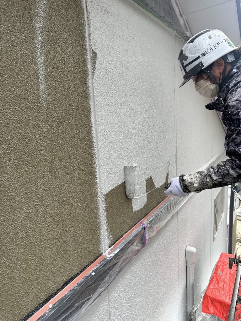 外壁に関しましてはリシン壁の為、エスケー化研の水性ハイブリットシーラーを塗布いたしました。(下写真)