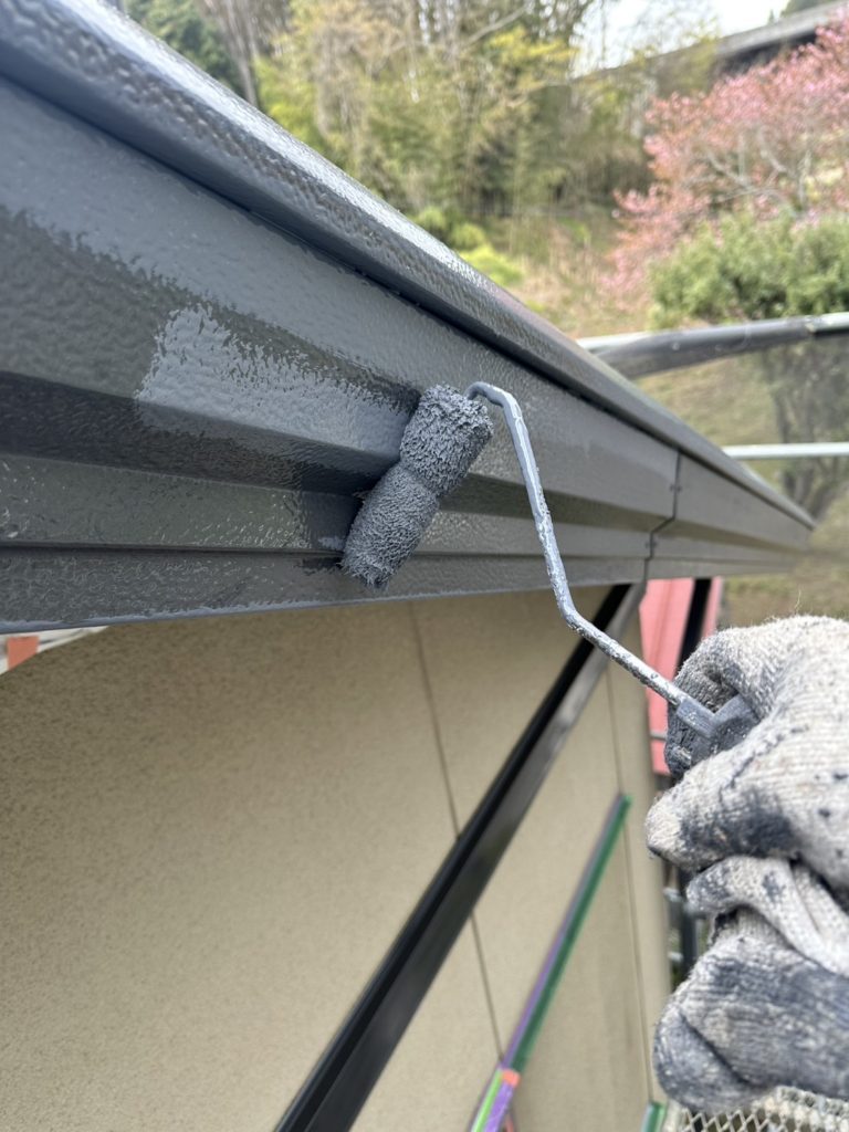 雨樋塗装作業:中塗り・仕上げ材にエスケー化研のクリーンマイルドウレタン RC107を塗布いたしました。(下写真)