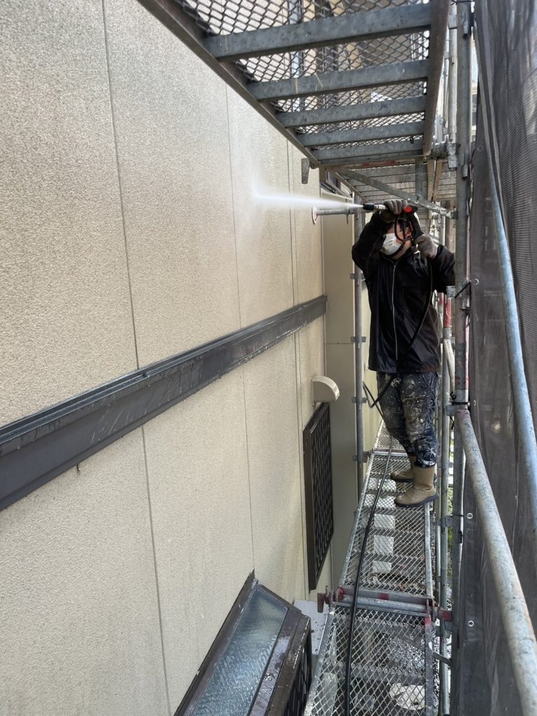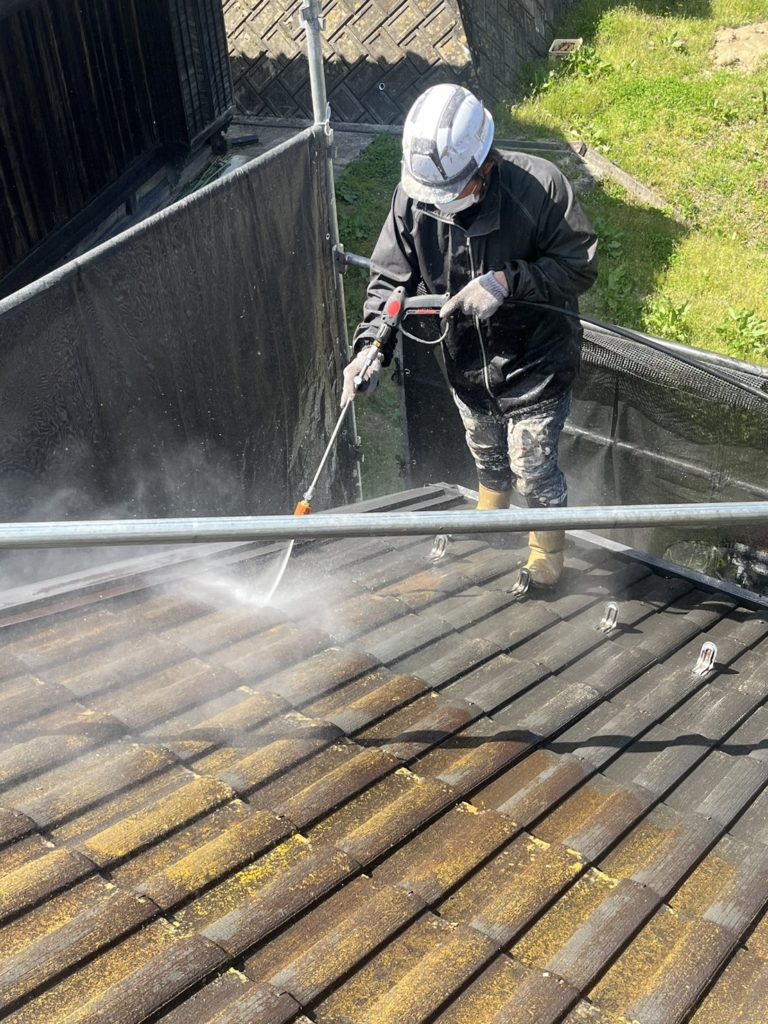 まず、塗装の前に高圧洗浄で、屋根・外壁全体の汚れをしっかり落としていきます!(下写真2枚)