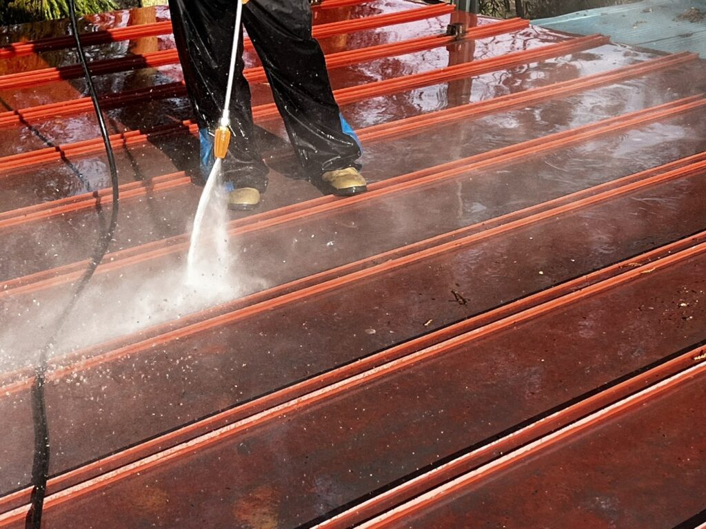 ・下地処理後に出たサビと汚れを高圧洗浄機でキレイに洗い流しました。(しっかり洗い流さないと剥離の原因に繋がる恐れがあります。)(下写真)