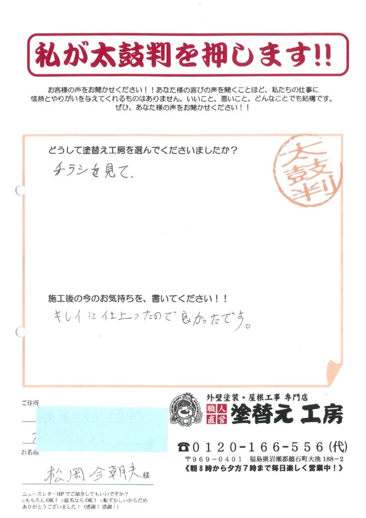 「松岡さん。今回、百年塗装店(旧:塗替え工房)を選んでご依頼をして頂き誠にありがとうございました。