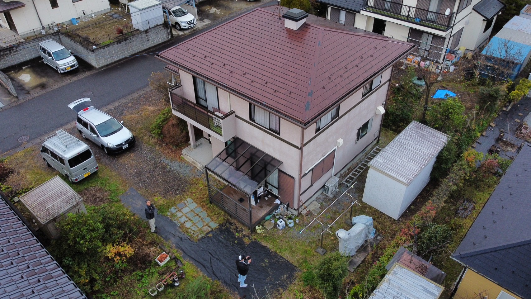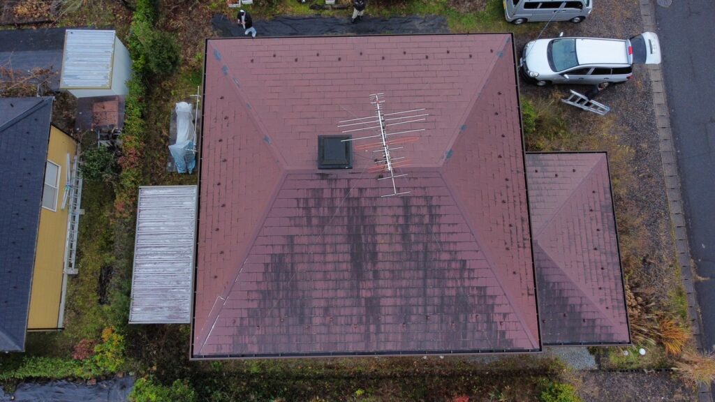 調査時のヒヤリングで屋根の汚れと板金の剥がれ・外壁に関しては凍害の膨れが気になるとの事で、実際ドローン調査しました。塗膜の剥がれ・屋根全体的に汚れ、コケ等の付着が見受けられました。松岡さんの方から長持ちさせたいとの事でしたので、今回屋根無機プランをご提案させていただきました。