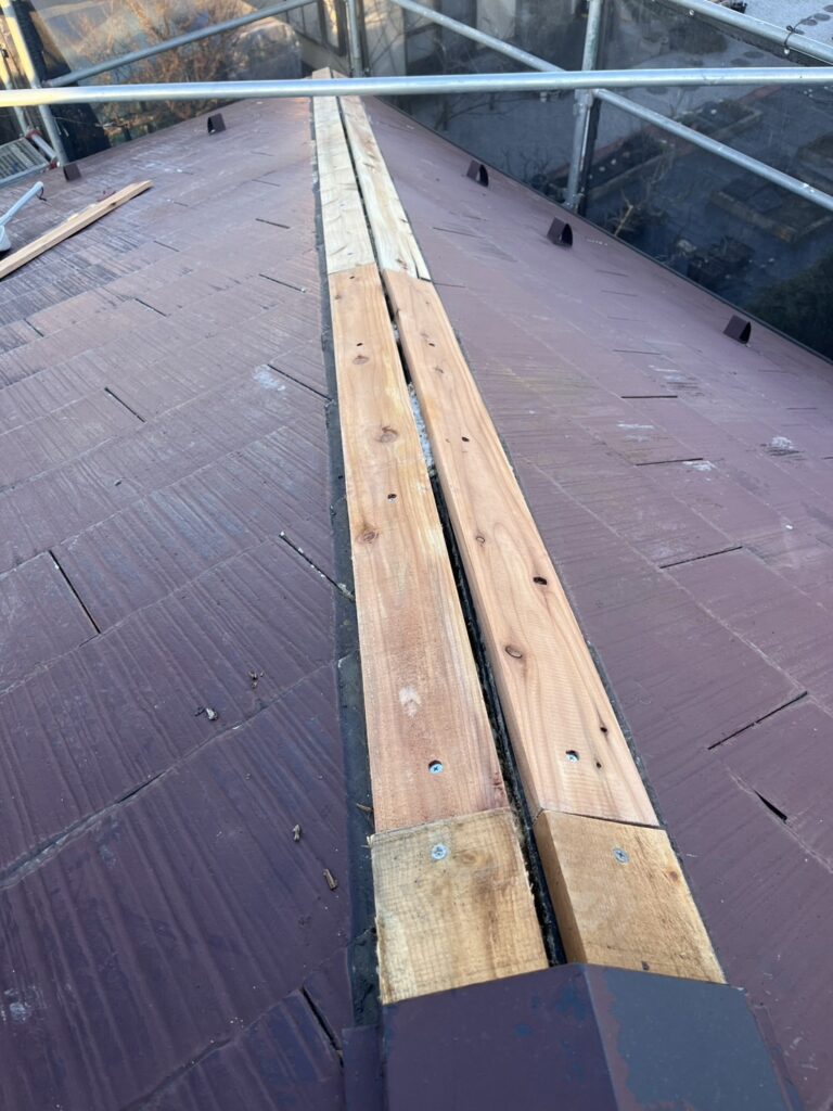 屋根棟板金の一部下地が腐食しており、下地交換し既存の棟板金を取付しました。(下写真2枚)