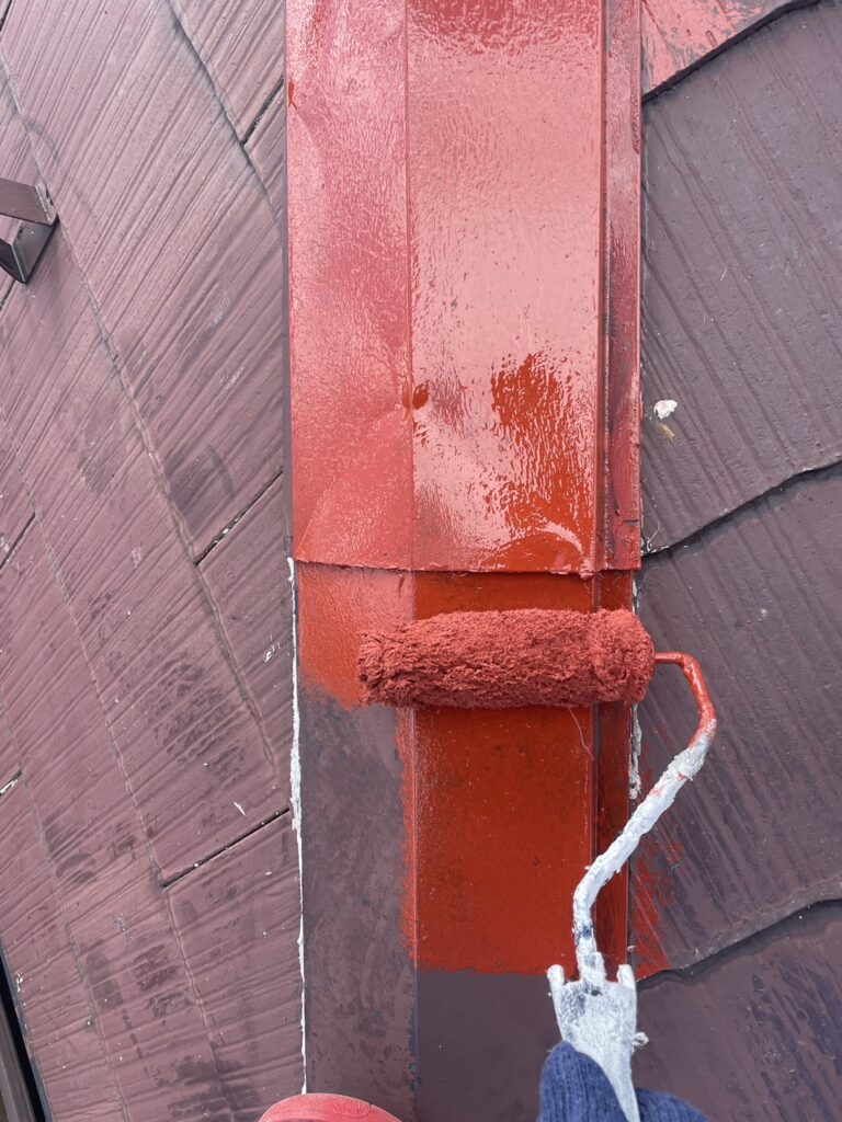 ・全体を高圧洗浄後、屋根の下塗りに関西ペイントダイナミックシーラーマイルド 透明(標準色)、棟板金箇所は1液エスコマイルド 赤さび色(標準色)を塗布しました。(下写真2枚)