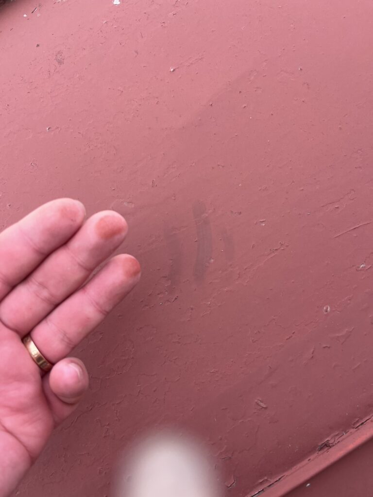 施工前の写真。屋根全体がチョーキングしており、雪止め、屋根の一部でサビ・塗膜剥離が発生しておりました。(下写真2枚)