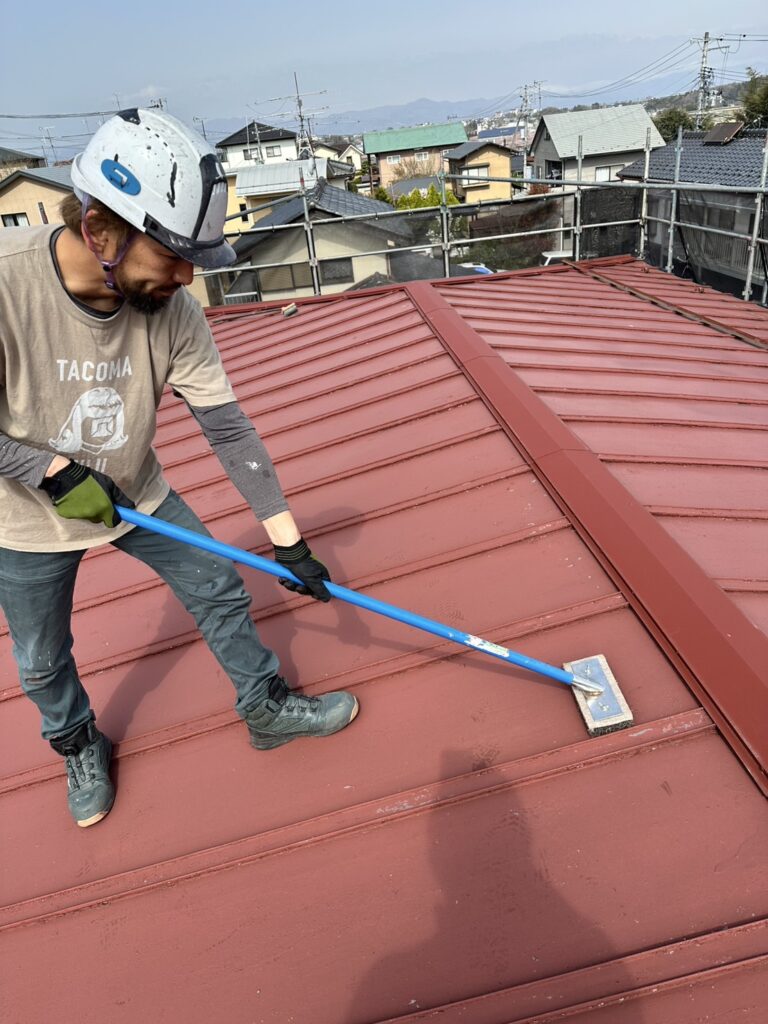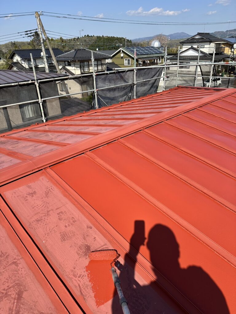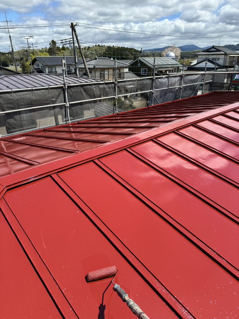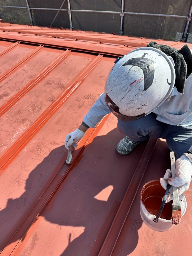・屋根全体の高圧洗浄後、下塗りに関西ペイント1液エスコマイルド 赤さび色(カタログ色)を塗布しました。