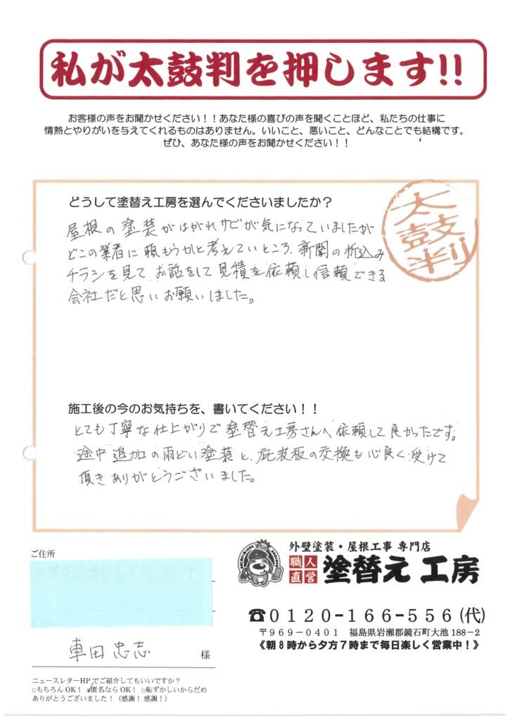 「車田さん。今回百年塗装店(旧:塗替え工房)を選んでご依頼をして頂き誠にありがとうございました。