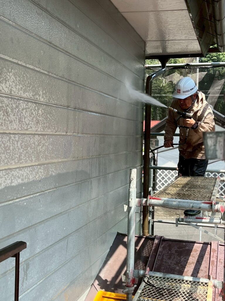 ・屋根、外壁全体の高圧洗浄後、下塗りの工程に移ります。