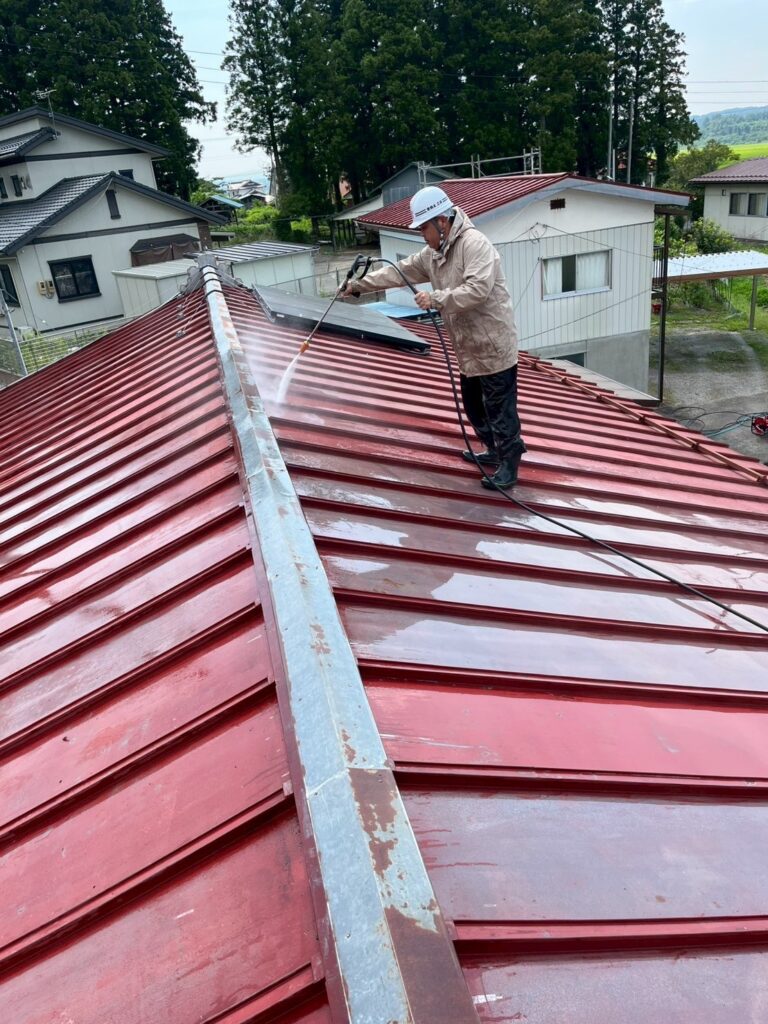 下地処理後屋根・外壁全体を高圧洗浄でサビとゴミを洗い流しました。