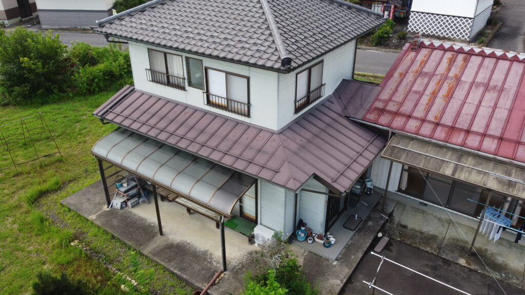 屋根の状況が気になるので見てほしい事でしたので今回調査いたしました‼実際調査してみますと、母屋・小屋のサビがひどく隠居の下屋根、外壁に関しましてはチョーキングが見受けられました。車田さんとの打ち合わせをしていく上で今回ラジカルプランを提案させていただきました。施工中も職人に気を使って頂き差し入れまでいただいて大変助かりました。また、解体時駐車場のコンクリートを破損させてしまい大変申し訳ございませんでした。破損した箇所につきましてはしっかりと現状復旧いたしましたのでご安心ください。