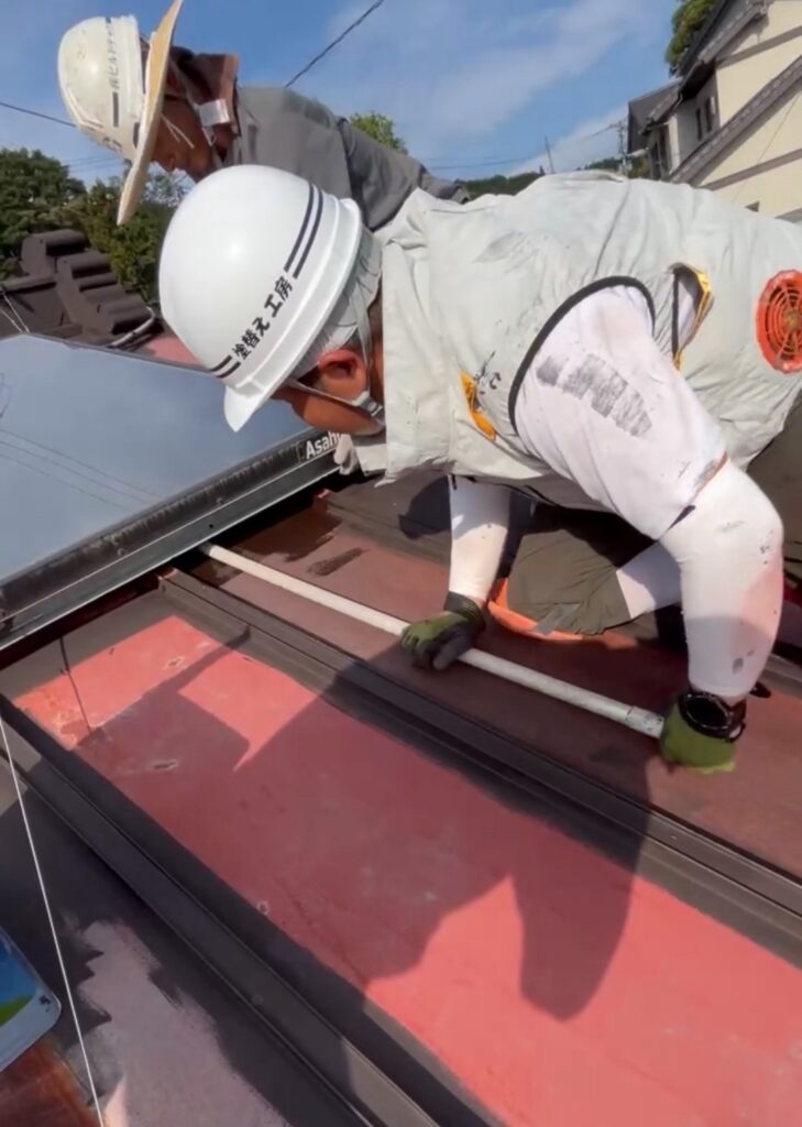 下塗り後ローラーを使用し、屋根全体に塗布いたしました。下塗り同様、細かい箇所・狭い箇所につきましては刷毛を使用し塗料塗布いたしました(下写真4枚)