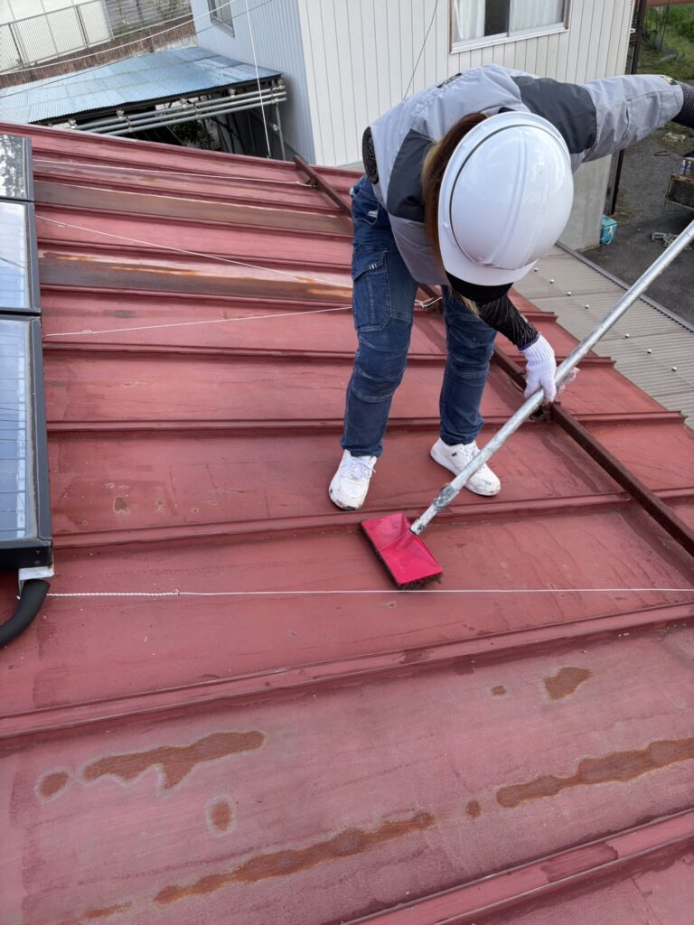 ・屋根全体を専用工具を使用し、汚れとサビ落としを行いました。下地処理をしないと剥がれの原因に繋がりますのでしっかりと行いました❕
