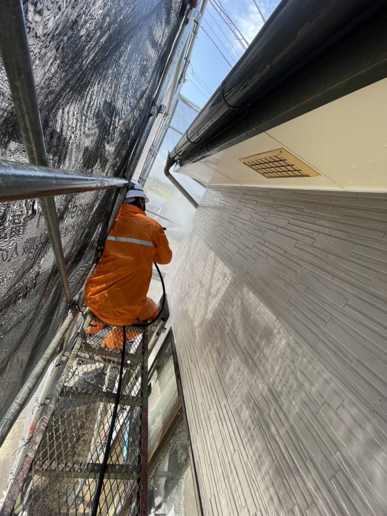 外壁も同じように高圧洗浄で壁の汚れを落としていきます。(下写真)