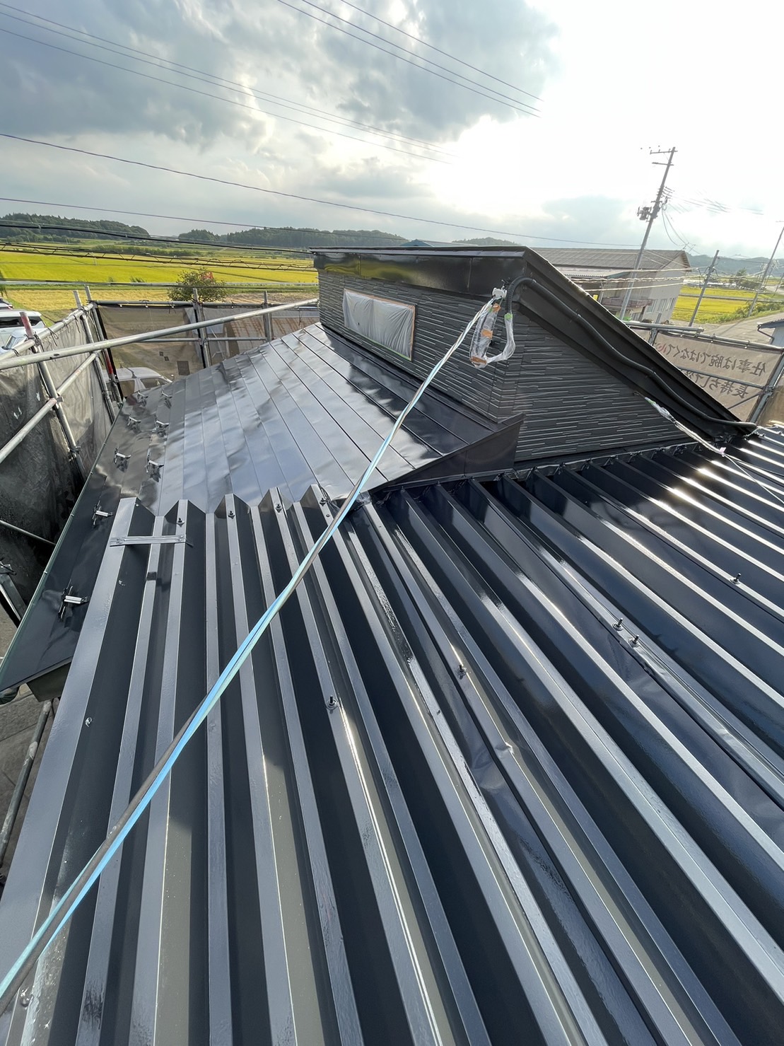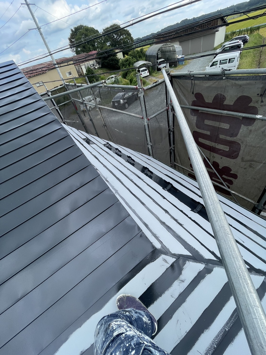 次は中塗りです。今回は、お客様が選んでくれた色はブラックネス。塗料は日本ペイントのファインパーフェクトルーフで施工いたします。屋根の重なり部分はしっかりと刷毛を入れて塗装を行います。(下写真)