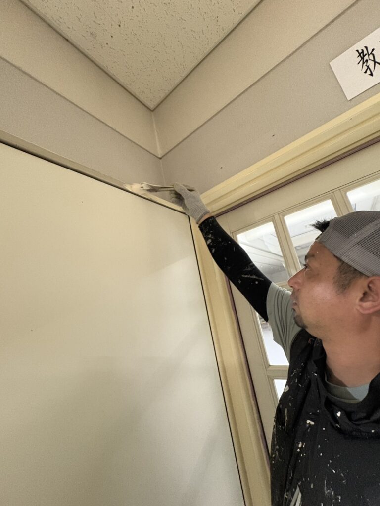 今回の現場では、室内ドアや窓まわりの枠を新しい色に塗り替える作業です。枠は毎日目に入る部分なので、きれいになるとお部屋全体の印象もパッと明るくなります。