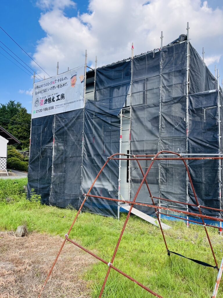 仮設足場からの工事スタートです。他のお客様にも百年塗装店(旧:塗替え工房)を知ってもらえるようにイメージシートもバッチリです✨