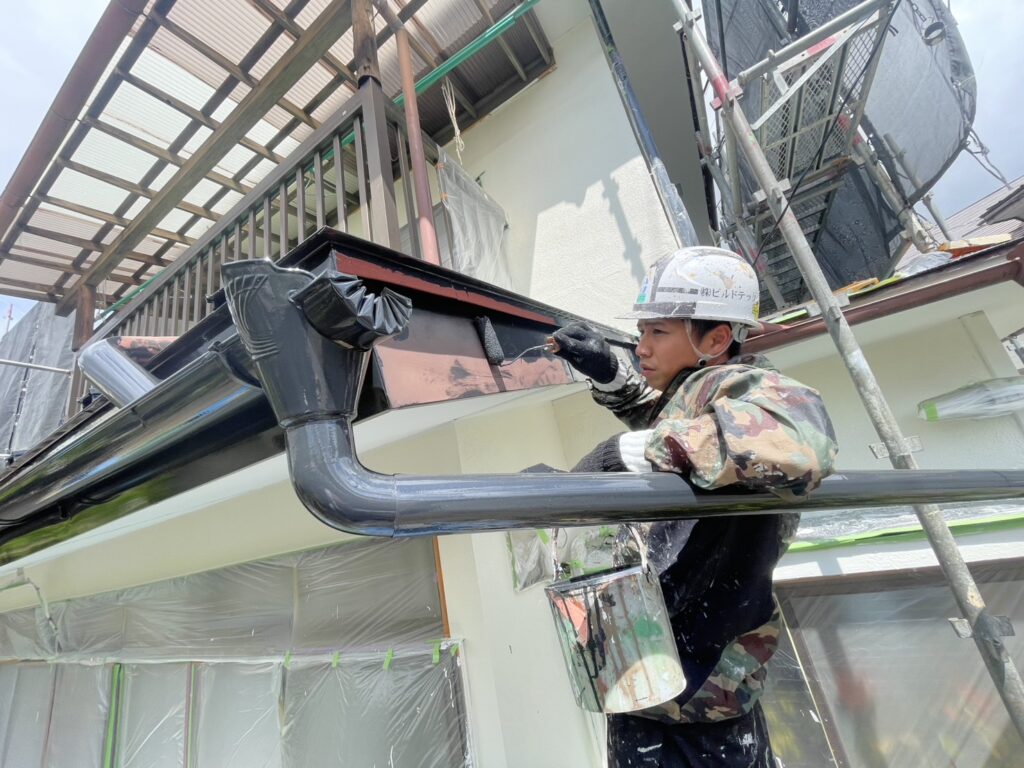 付帯部中塗りの作業風景‼上を向いているので首が痛い😓