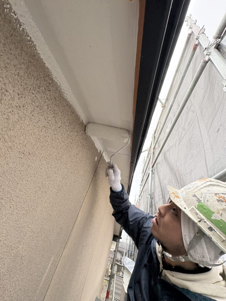 ローラーと刷毛を駆使して軒天を塗装していきます。(下写真)