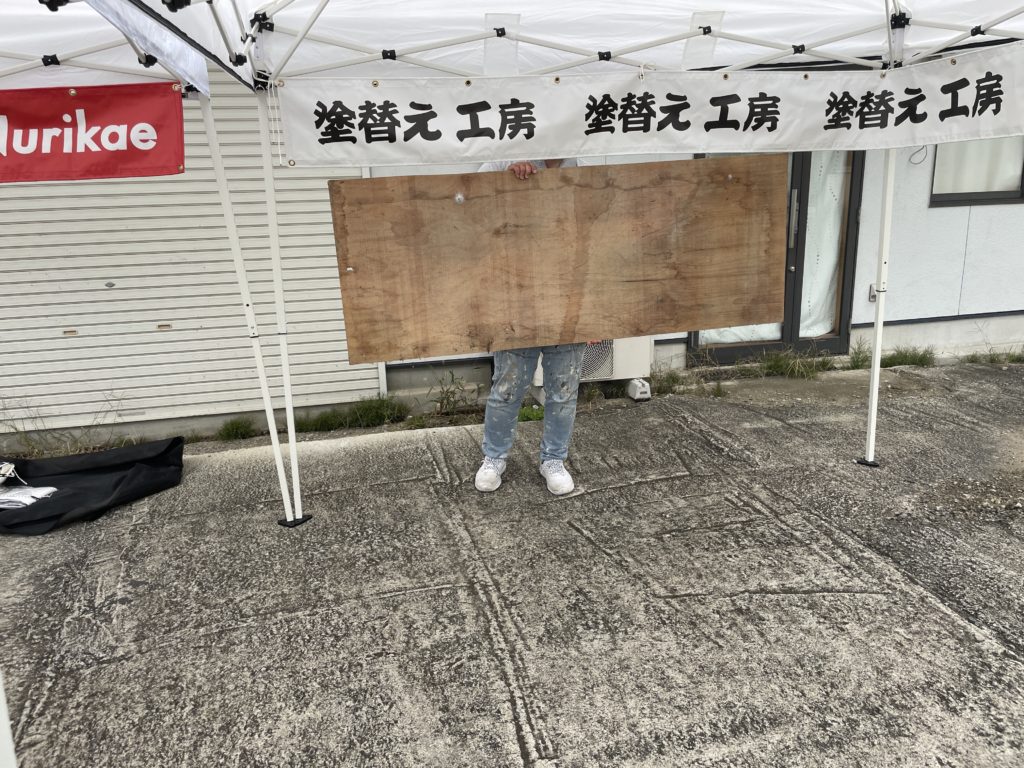 塩澤部長が本日塗装体験で子供達が安全に体験できるようにセッティングの練習をおこなってます。