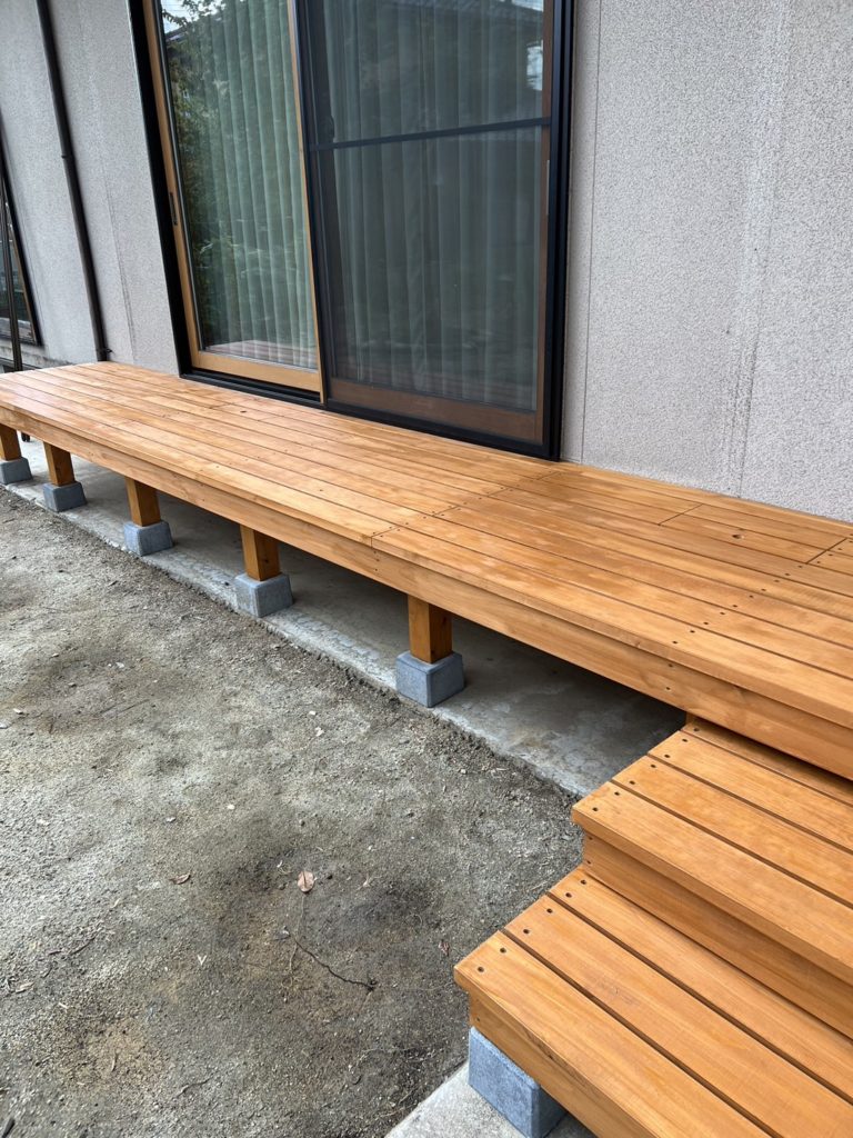 本日は棚倉町和知様邸の作業風景になります。先日大工からウッドデッキが組みあがったと連絡があり本日塗装にお伺いしました。お客様からの指定でキシラデコールのピニー色!!