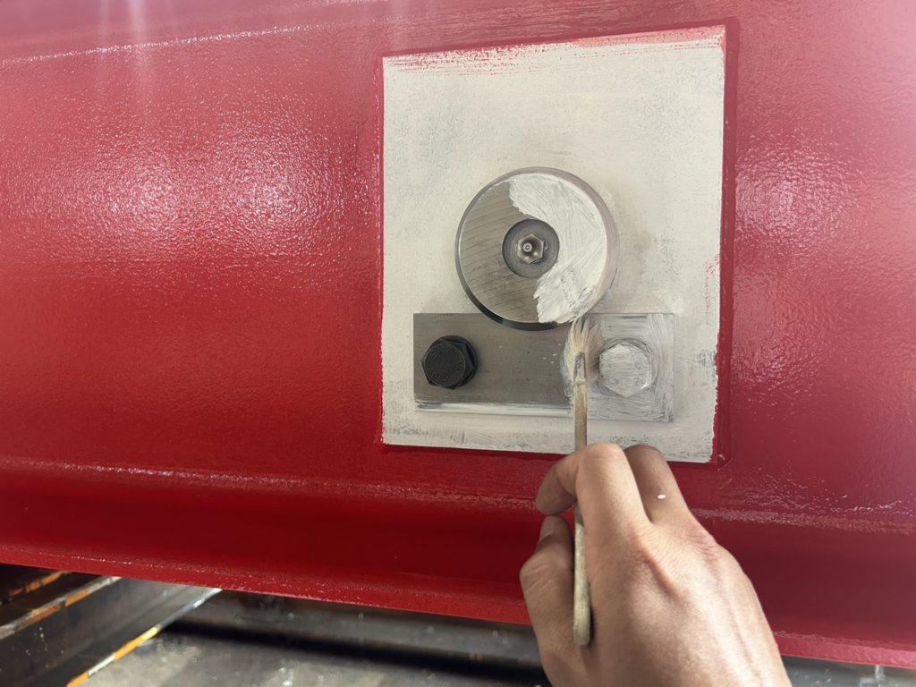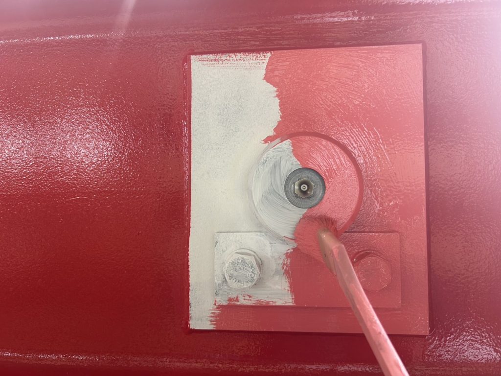鉄工所指定の材料を塗布していきます。鮮やかな赤色ですね。