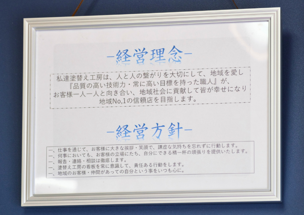 私は、須賀川市と鏡石町の皆様に育てられ、今に至ります。そのことは感謝しても感謝しつくせません。地元の皆さまに私ができる唯一の「恩返し」は私の塗装の腕で皆さまのお家をお守りすることだけです。